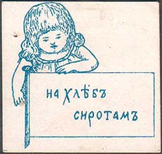 1915 1915(?) г. Разм. 38 х 36 мм. Одноцветная печать на сероватой бумаге с мелованным верхним слоем. В центре девочка, держащая флажок с текстом в две строки: «Сиротам на хлеб».