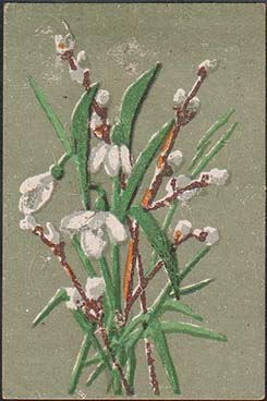 1915 1915(?) г. Разм. 41 х 62 мм. Многоцветная печать на сероватой бумаге с мелованным верхним слоем. В центре букет из веток вербы и подснежников.