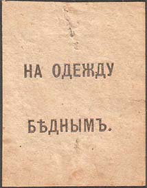 1915 1915(?) г. Разм. 35 х 45 мм. Одноцветная печать на желтоватой бумаге. В центре текст в две строки: «На одежду бедным».