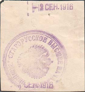 1916 1916 г. Разм. 48 х 52 мм. Одноцветная печать на белой бумаге. На лицевой стороне фиолетовый оттиск круглой печати училища диаметром 37 мм. В центре печати герб России. По окружности текст: «Старорусское высшее начальное училище». Также на лицевой стороне ручным штампом фиолетовый оттиск даты: «2 сент. 1916».