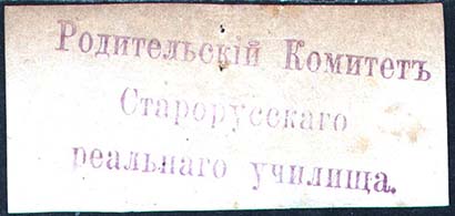 1917 1917 г. 24.-25.09.1917 г. Разм. 67 х 31 мм. Одноцветная печать на желтоватой бумаге. Текст в три строки: «Родительский Комитет Старорусского реального училища». Сбор в пользу ученической столовой.