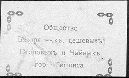 1912 1912(?) г. Разм. ≈ 70 х 42 мм. Одноцветная печать на светло-красно-коричневой бумаге. В рамке из декоративных уголков текст в четыре строки: «Общество Бесплатных, дешевых Столовых и Чайных гор. Тифлиса».
