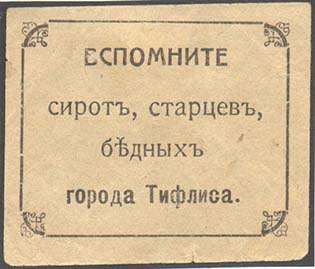 1912 1912(?) г. Разм. рамки 45 х 36,5 мм. Одноцветная печать на белой бумаге. В рамке текст в четыре строки: «Вспомните сирот, старцев, бедных города Тифлиса».