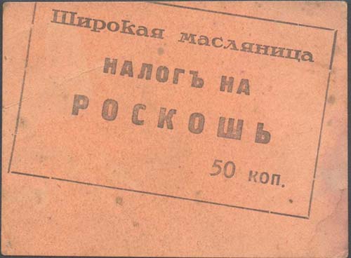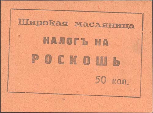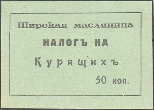1914 1914(?) г. Разм. рамки 73 х 46 мм. Одноцветная печать на бумаге различных цветов. В рамке сверху текст: «Широкая масляница». В правом нижнем углу номинал. В центре различные тексты в две строки.