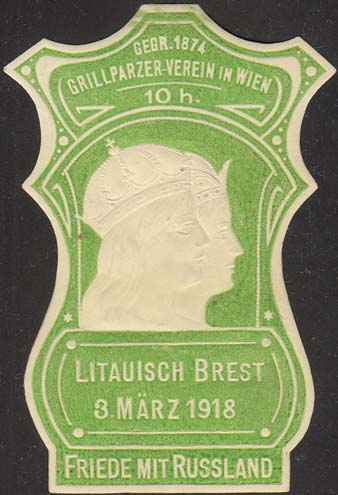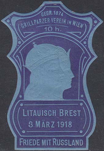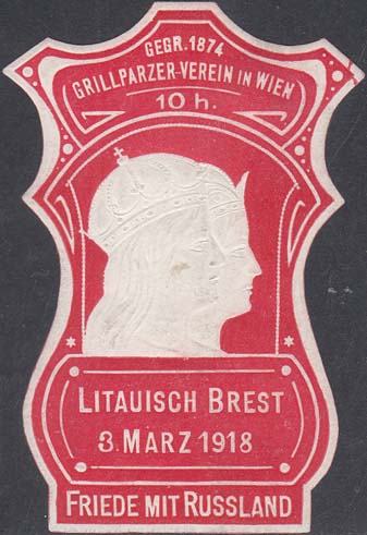 1918 г. Виньетка сложной формы разм. 56 х 82 мм. Двухцветная печать с тиснением на белой бумаге. В центре две женские головы в коронах в профиль. Тексты на немецком языке.