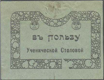1916 1916(?) г. Разм. 72 х 55 мм. Одноцветная печать на зеленой бумаге. В декоративной рамке из растительного орнамента текст в две строки: «В пользу ученической столовой».