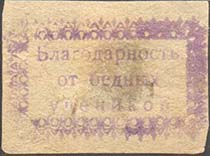 1916 1916(?) г. Разм. 36 х 26 мм. Одноцветная печать на серо-желтой бумаге низкого качества. В центре в рамке из орнамента текст в три строки: «Благодарность от бедных учеников».