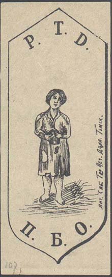 1917 1917 г. 10.10.1917 г. Разм. 37 х 91 мм. Одноцветная печать на тонкой белой бумаге. В центре в фигурной рамке сложной формы разм. 33 х 85 мм подросток в изношенной одежде. Внизу аббревиатура П.Б.О. на русском языке, сверху та же аббревиатура на польском языке. Справа вертикально снизу вверх выходные данные мелким шрифтом: «Лит. Сиб. Т-во Печ. Дела. Томск».