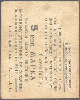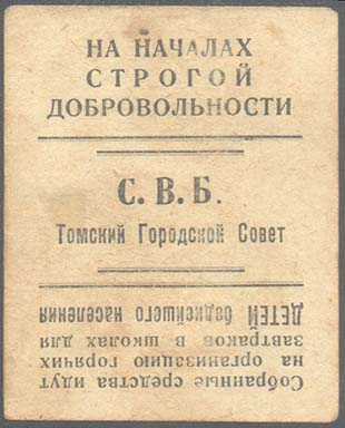 1930 1930 г. 1930 г. Разм. 51 х 63 мм. Одноцветная двухсторонняя печать на бумаге различных цветов. На лицевой стороне в центре текст в две строки: «С.В.Б. Томский Городской Совет». Сверху текст в три строки: «На началах строгой добровольности». Внизу перевернутый текст в четыре строки: «Собранные средства идут на организацию горячих завтраков в школах для детей беднейшего населения». На оборотной стороне снизу вверх текст в двенадцать строк: «Борьба против религии – Борьба за социализм! «Проведение всеобщего обязательного первоначального обучения и ликвидация неграмотности должно стать боевой задачей» 16 съезд ВКП(б) ... коп. Марка (выдается вместо квитанции) активному участнику по созданию безбожного фонда по ВНО. Штаб при Том. Г.С.С.В.Б.».