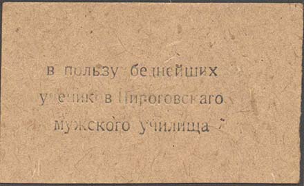 1916 1916(?) г. Разм. 74 х 44 мм. Одноцветная печать на серо-желтой бумаге низкого качества. В центре текст в три строки: «В пользу беднейших учеников Пироговского мужского училища».