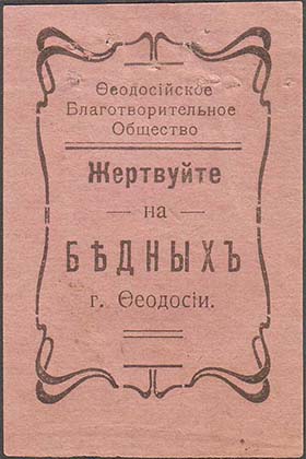 1916 1916 г. Разм. 46 х 69 мм. Одноцветная печать на темно-серой бумаге. В фигурной декоративной рамке разм. 38 х 57 мм в центре текст в четыре строки: «Жертвуйте на бедных г. Феодосии». Сверху и снизу декоративные элементы в виде горизонтальных штрихов. Сверху текст в три строки: «Феодосийское Благотворительное Общество».