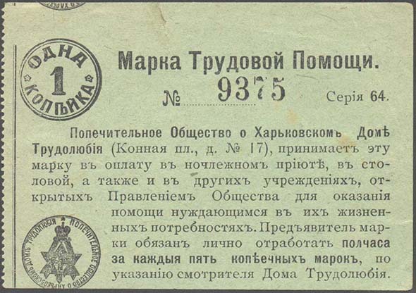 1912 1912(?) г. Листок из квитанционной книжки разм. 99 х 69 мм. Одноцветная печать светло-зеленой бумаге. Левосторонняя зубц. 11 1/2. Сверху в центре текст в две строки: «Марка Трудовой Помощи. №... Серия ...». Слева в двойной круглой рамке номинал. Ниже текст в десять строк: «Попечительное Общество о Харьковском Доме Трудолюбия (Конная пл., д. № 17), принимает эту марку в оплату в ночлежном приюте, в столовой, а также и в других учреждениях, открытых Правлением Общества для оказания помощи нуждающимся в их жизненных потребностях. Предъявитель марки обязан лично отработать полчаса за каждые пять копеечных марок, по указанию смотрителя Дома Трудолюбия». В левом нижнем углу эмблема общества.