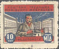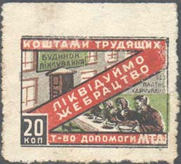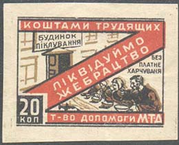 1932 1932(?) г. Многоцветная печать на белой рыхлой бумаге. Текст на украинском языке: «Средствами трудящихся ликвидируем нищенство. Отделение общества Г[ородских] О[бществ] П[помощи]».