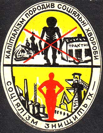 1931 1931 г. 15.08.1931 г. Виньетка в форме овала разм. 55 х 71 мм. Трехцветная печать на белой бумаге. В двойной овальной рамке аллегорический рисунок: сверху силуэт больного человека на фоне трактира и церкви, внизу силуэт здорового человека на фоне заводов. По периметру между рамками текст на украинском языке: «Капитализм породил социальные болезни – социализм уничтожит их». Внизу под рамкой выходные данные мелким шрифтом неразборчиво.