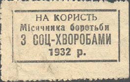 1932 1932 г. Разм. 37 х 18 мм. Одноцветная печать на желтоватой бумаге. В прямоугольной рамке текст на украинском языке в четыре строки: «В пользу месячника борьбы с соц[иальными]-болезнями 1932 г.».