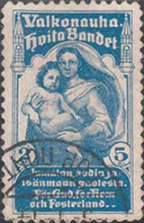 1905 1905 г. Разм. рамки 20 х 33,4 мм. Одноцветная печать на белой бумаге. Зубц. 11 1/2. С клеем. В прямоугольной декоративной рамке в центре женщина с младенцем на руках. Тексты на финском и шведском языках. Внизу по бокам номинал в круглых рамках.