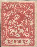 1912 1912(?) г. 1912(?) г. Разм. Рамки 17 х 23,5 мм. Одноцветная печать на сероватой бумаге. В рамке в центре сидящая женщина и дети. Сверху полукругом текст в две строки: «В пользу благот[ворительных] завед[ений]. Ярос[лавской]. Г[убернии].». Внизу в овальной рамке номинал.