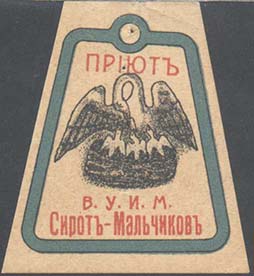 1913 1913 г. Виньетка в форме трапеции разм. 46 х 42 мм. Трехцветная печать на кремовой бумаге. В центре эмблема В.У.И.М. Текст: «Приют В.У.И.М. Сирот-Мальчиков».