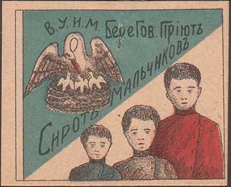 1915 1915(?) г. Разм. рамки 50,5 х 41 мм. Трехцветная печать на плотной кремовой бумаге. Прямоугольная рамка разделена по диагонали пополам. В левом верхнем углу эмблема ВУИМ и текст в две строки: «В.У.И.М. Берегов. Приют сирот мальчиков». В правом нижнем углу трое детей.