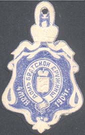 1904 1904 г. 04.05.1904 г. Виньетка в виде щитка сложной формы разм. 28 х 45 мм с ушком для крепления. Одноцветная печать на белой бумаге с тиснением. Изображение знака одного из благотворительных обществ.