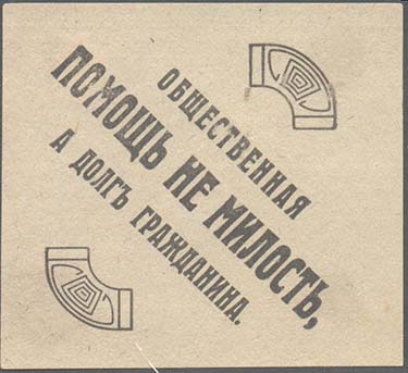 1915 1915(?) г. Ромб разм. 84 х 84 мм. Одноцветная печать на серой бумаге. В центре текст в три строки: «Общественная помощь не милость, а долг гражданина». Сверху и снизу декоративные элементы.