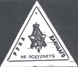 1915 1915(?) г. Треугольник разм. 58 х 49 мм. Одноцветная печать на белой бумаге. В центре в треугольной рамке знак одного из благотворительных обществ. По внутреннему периметру рамки текст: «Рука дающего не оскудеет».