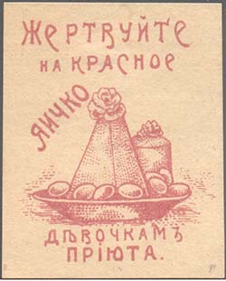 1915 1915(?) г. Разм. 41 х 51 мм. Одноцветная печать на желтоватой бумаге. В центре на тарелке кулич, пасха и пасхальные яйца. Сверху текст в три строки: «Жертвуйте на красное яичко». Внизу продолжение текста в две строки: «Девочкам приюта».