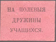 1915 1915(?) г. Разм. 38 х 29 мм. Одноцветная печать на розовой бумаге. В центре текст в три строки: «На полевые дружины учащихся».