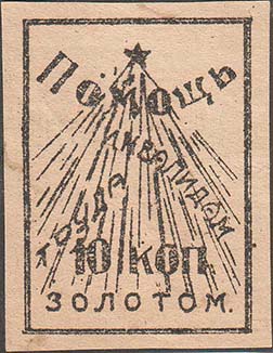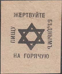 1915 1915(?) г. Разм. 36 х 43 мм. Одноцветная печать на серой бумаге. В центре шестиконечная звезда. По периметру текст: «Жертвуйте бедным на горячую пищу».
