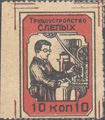 1927 1927(?) г. Разм. рамки 25 х 35 мм. Двухцветная печать на желтоватой бумаге на оборотной стороне топографических карт. Зубц. 11 1/2. В двойной прямоугольной рамке слепой рабочий у станка. Сверху текст в две строки: «Трудоустройство слепых». Внизу номинал. Справа внизу под рамкой мелким шрифтом выходные данные: «Лит. Г. Ордж.».