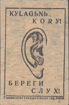 1925 1925(?) г. Разм. рамки 48 х 73 мм. Одноцветная печать на серо-коричневой бумаге низкого качества. В прямоугольной рамке в центре изображение уха человека. Сверху текст в две строки на азербайджанском языке латинской графикой. Внизу текст в две строки: «Берегите слух». Внизу под рамкой мелким шрифтом выходные данные: «Главлит 6449 Тип Серп и молот тир. 50000».