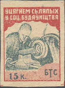 1931 1931 г. Разм. рамки 32 х 42 мм. Двухцветная печать на сероватой рыхлой бумаге. Слепой токарь у станка. Сверху текст на белорусском языке: «Вовлечем слепых в соц[иалистическое]. строительство». Внизу номинал и аббревиатура на белорусском языке: «БОС».