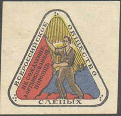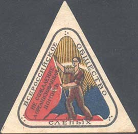 1932 1932(?) г. Разм. 38 х 38 мм. Многоцветная печать на белой бумаге. В треугольной с закругленными краями рамке на фоне восходящего солнца слепой держит флаг, на котором текст: «Не сожаление, а организованная помощь». По периметру рамки текст: «Всероссийское общество слепых».
