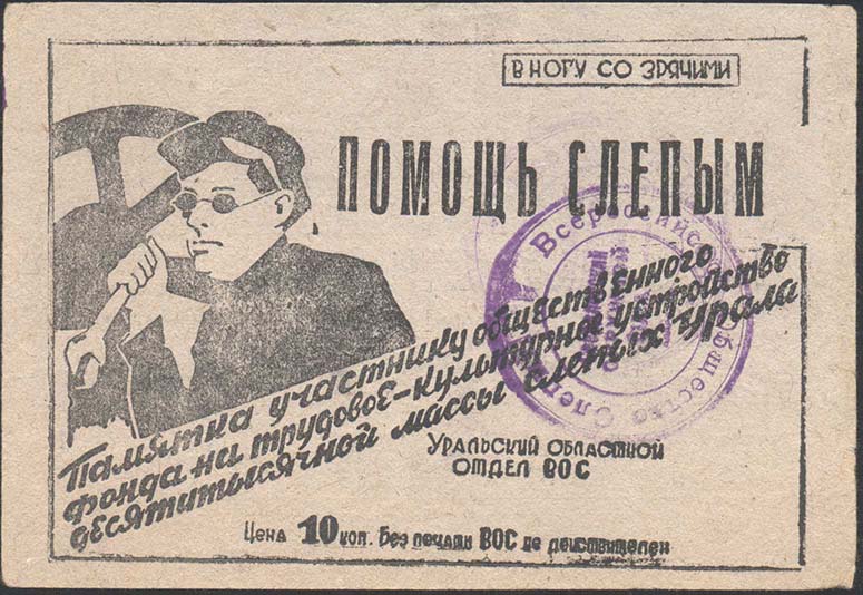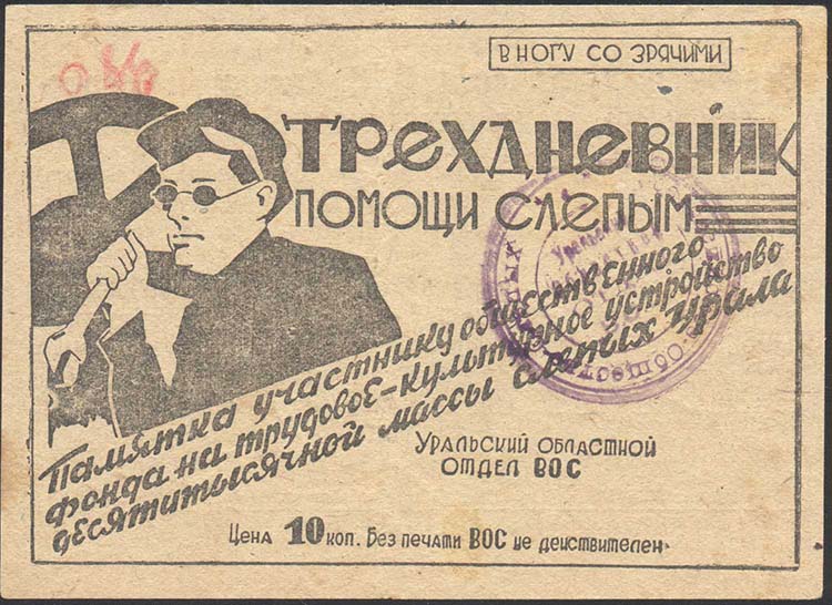 1932 1932 г. Областной сбор. Одноцветная двухсторонняя печать на толстой бумаге низкого качества различных цветов. На лицевой стороне в рамке разм. 116 х 82 мм слева слепой рабочий с гаечным ключом на фоне заводского оборудования. Текст: «В ногу со зрячими. Трехдневник помощи слепым. Памятка участнику общественного фонда на трудовое-культурное устройство десятитысячной массы слепых Урала. Уральский областной отдел ВОС. Цена 10 коп. Без печати ВОС не действителен». На оборотной стороне фрагмент речи М.И.Калинина к Всероссийскому трехдневнику помощи слепым. Внизу мелким шрифтом выходные данные: «Уралоблит N 5173. Изд. Общества Слепых Тираж 100000 Свердловск, «Уралполиграф», тип. «Гранит». зак. N 2796». На лицевой стороне фиолетовый оттиск круглой печати Уральского областного отделения ВОС.