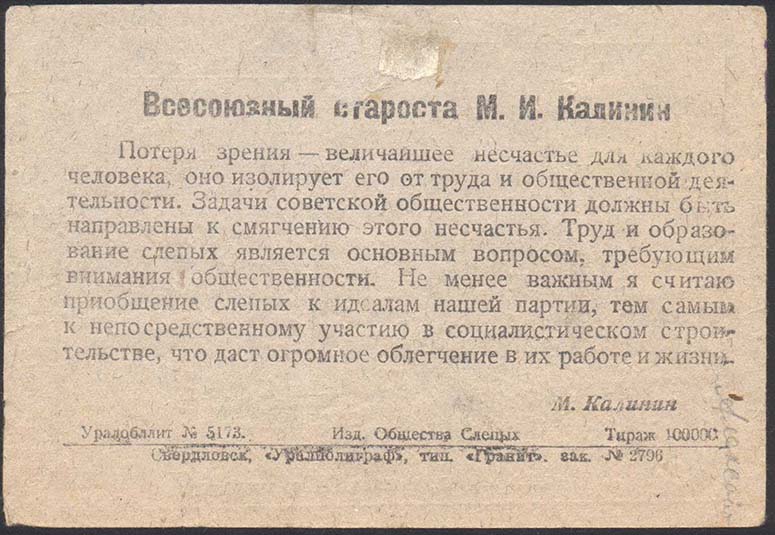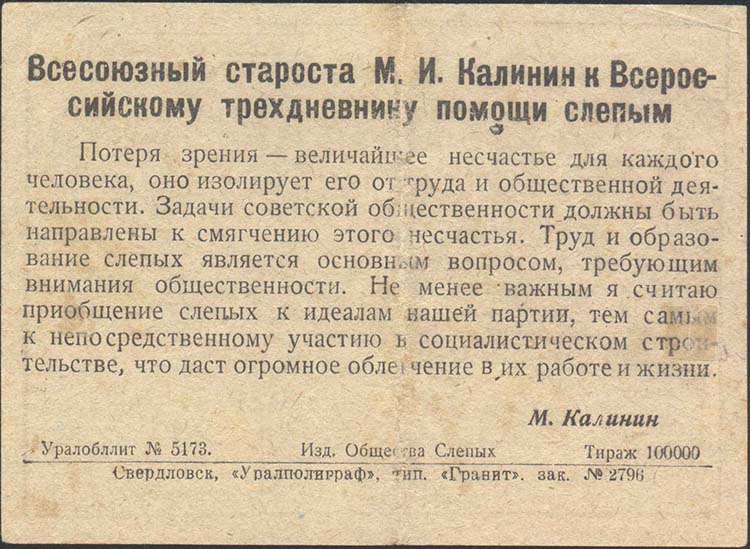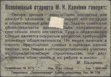 1932 1932 г. Областной выпуск. Одноцветная двухсторонняя печать на толстой бумаге низкого качества различных цветов. На лицевой стороне в рамке разм. 75 х 52 мм слева слепой рабочий с гаечным ключом на фоне заводского оборудования. Текст: «В ногу со зрячими. Создадим всеуральский трудовой комбинат слепых. Памятка участнику обще-ственного фонда на трудовое-культурное устройство пятнадцатитысячной массы слепых Урала. Уральский областной отдел ВОС. Цена 10 коп.». На оборотной стороне фрагмент речи М.И.Калинина к Всероссийскому трехдневнику помощи слепым. Внизу мелким шрифтом выходные данные: «Уралоблит N 5173. Изд. О-ва Слепых Тираж 100000 Свердловск, «Уралполиграф», Хро-мо-литография. зак. N 338».