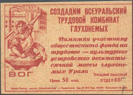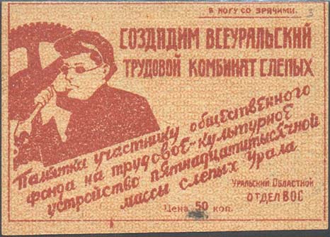 1931 1931 г. Двухцветная двухсторонняя печать на плотной желтоватой бумаге. На лицевой стороне в рамке разм. 75 х 52 мм слева слепой рабочий с гаечным ключом на фоне заводского оборудования. Текст: «В ногу со зрячими. Создадим Всеуральский Трудовой комбинат слепых слепым. Памятка участнику общественного фонда на трудовое-культурное устройство десятитысячной массы слепых Урала. Уральский областной отдел ВОС. Цена ... коп. На оборотной стороне фрагмент в рамке разм. 75 х 51 мм слева рабочий с молотом и наковальня на фоне заводских корпусов. Текст: «Создадим всеуральский трудовой комбинат глухонемых. Памятка участнику общественного фонда на трудовое-культурное устройство пятнадца-титысячной массы глухонемых Урала. Уральский Областной отдел ВОГ. Цена 50 коп.». Внизу мелким шрифтом выходные данные: «Хромо-Литогр. Треста «Уралполиграф» г. Свердловск Зак №392. Тир. 300.000. Уралоблит N 3699».