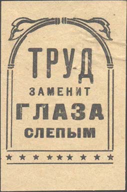 1928 1928 г. Октябрь Разм. 42 х 64 мм. Одноцветная печать на желтоватой бумаге. В центре в декоративной рамке текст в четыре строки: «Труд заменит глаза слепым».