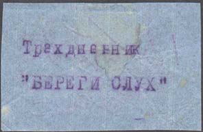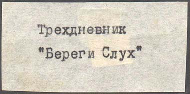 1927 1927(?) г. Разм. 60 х 30 мм. Одноцветная печать на бумаге различных цветов. В центре машинописный текст в две строки: «Трехдневник «Берегите слух»».