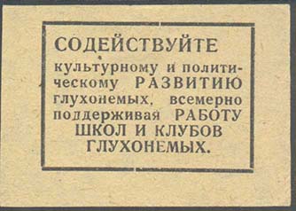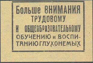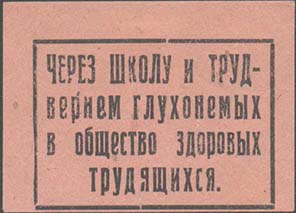 1927 1927(?) г. Разм. 50 х 35 мм. Одноцветная печать на бумаге различных цветов. В центре в прямоугольной рамке разм. 28 х 40 мм текст в четыре строки: «Через школу и труд - вернем глухонемых в общество здоровых трудящихся».