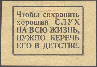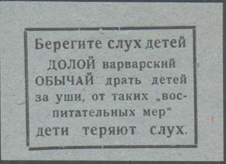 1927 1927(?) г. 54 х 35 мм. Одноцветная печать на серо-синей бумаге. В центре в прямоугольной рамке разм. 40 х 27 мм текст в шесть строк: «Берегите слух детей. Долой варварский обычай драть детей за уши, от таких «воспитательных мер» дети теряют слух».