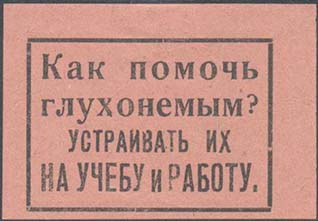 1927 1927(?) г. Разм. 50 х 35 мм. Одноцветная печать розово-серой бумаге. В центре в прямоугольной рамке разм. 40 х 28 мм текст в четыре строки: «Как помочь глухонемым? Устраивать их на учебу и на работу».