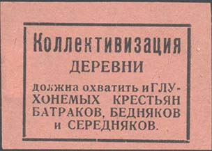 1927 1927(?) г. Разм. 50 х 36 мм. Одноцветная печать на желто-серой бумаге. В центре в прямоугольной рамке разм. 40 х 28 мм текст в шесть строк: «Коллективизация деревни должна охватить и глухонемых крестьян батраков, бедняков и середняков».