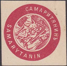 1915 1915(?) г. Ромб разм. 60 х 60 мм. Одноцветная печать на белой бумаге. В центре толстой круглой рамке разм. 37 мм иллюстрация библейского сюжета о добром Самаритянине. По периметру на сплошном фоне текст на русском языке и на латыни(?): "Самаритянин".