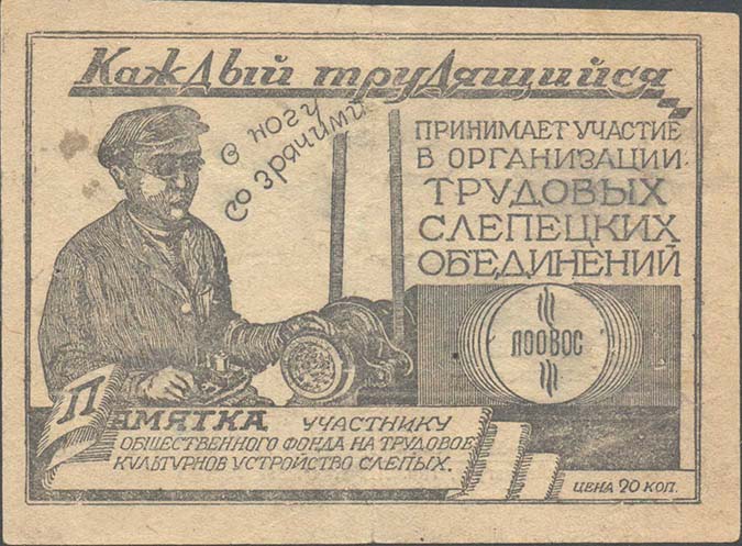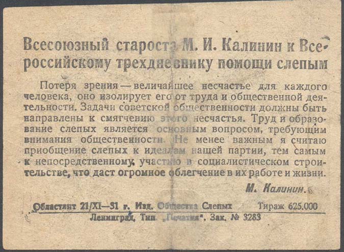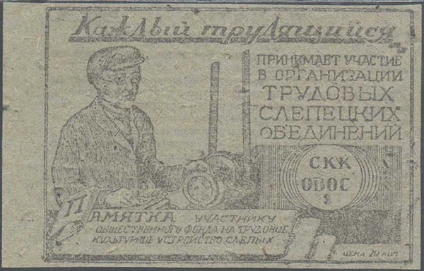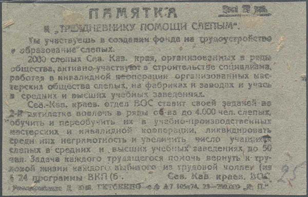 1932 1932 г. Областной сбор. Разм. рамки 88 х 60 мм. Двухсторонняя од-ноцветная печать на бумаге различных цветов. В двойной тонкой прямоугольной рамке слепой у станка. Сверху и справа текст в шесть строк: «Каждый трудящийся принимает участие в организации трудовых слепецких объединений». Внизу на ленте текст: «Памятка участнику общественного фонда на трудовое культурное устройство слепых». Справа в круглой рамке аббревиатура «СККОВОС». Справа внизу номинал: «Цена 20 коп.». На оборотной стороне фрагмент речи М.И.Калинина и выходные данные мелким шрифтом.