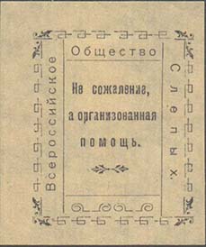 1926 1926 г. Разм. 44 х 56 мм. Одноцветная печать на бумаге различных цветов. В фигурной рамке с орнаментом в углах разм. 36 х 44 мм тонкая прямоугольная рамка. Между рамками текст: «Всероссийское общество слепых». В центре в три строки текст: «Не сожаление, а организованная помощь».