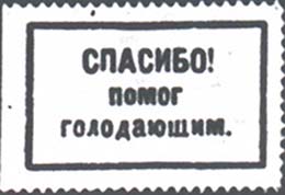 1922 1922(?) г. Разм. 40 х 30 мм. Одноцветная печать на светло-оранжевой бумаге. Зубц. 14 1/2. В прямоугольной рамке разм. 33 х 20 мм текст в три строки: «Спасибо! Помог голодающим».