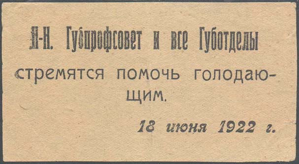 1922 1922 г. 18.06.1922 г. Разм. 102 х 55 мм. Одноцветная печать на желто-серой тонкой бумаге. В центре текст в три строки: «Н[ово]-Н[иколаевский]. Губпрофсовет и все Губотделы стремятся помочь голодающим. Внизу справа дата: «18 июня 1922 г.».