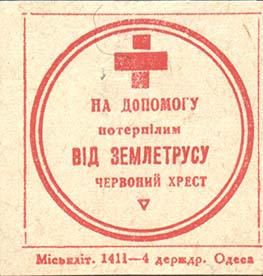 1931 1931 г. Май Разм. 46 х 47 мм. Одноцветная печать на серо-желтой бумаге. В прямоугольной тонкой рамке разм. 39 х 39 мм вписана двойная круглая рамка. В круглой рамке сверху красный крест, ниже текст в четыре строки на украинском языке: «На помощь пострадавшим от землетрясения. Красный Крест» Ниже орнамент в виде треугольника. Внизу под рамкой мелким шрифтом выходные данные на украинском языке: «Горлит. 1411-4. Гостип. Одесса».