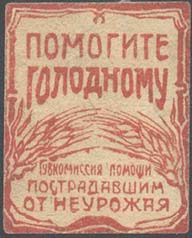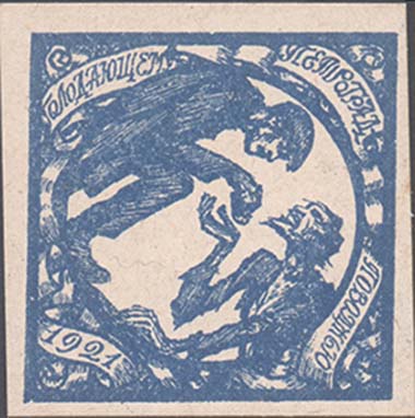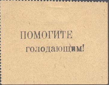 1921 1921 г. Разм. 62 х 44 мм. Одноцветная печать на белой бумаге. Зубц. 11 1/2. В центре текст в две строки: «Помогите голодающим!».