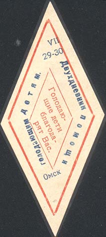 1924 1924(?) г. 29-30.07. Ромб разм. 31 х 80 мм. Двухцветная печать на белой бумаге. В двойной ромбовидной рамке разм. 30 х 67 мм текст в четыре строки: «Голодающие дети благодарят Вас». Между рамками по периметру текст: «VII 29-30 Омск Двухнедельник помощи голодающим детям».